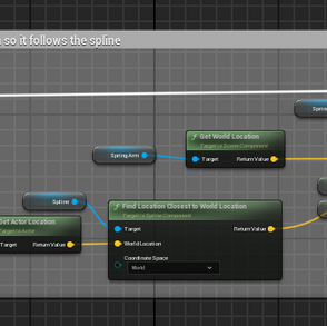 In response to this, I explored and implemented a dynamic camera system using splines, which allowed the camera to move along predefined paths. While this approach offered more flexibility, it introduced new challenges, particularly with player movement. The spline-based camera system sometimes struggled to keep up with the player's actions, leading to disorienting shifts in perspective and making it harder for players to navigate the game world effectively.